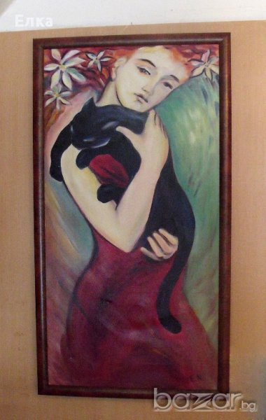 Картина "Момиче с котка", масло/платно, автор Елка Манева, 2014г., 95/50см. Рамкирана. Може да се види в ателие галерия "Бяло плюс", ул. "Г. Кръстевич" 5 /вътрешен двор/, спирка Лятно кино Тракия..