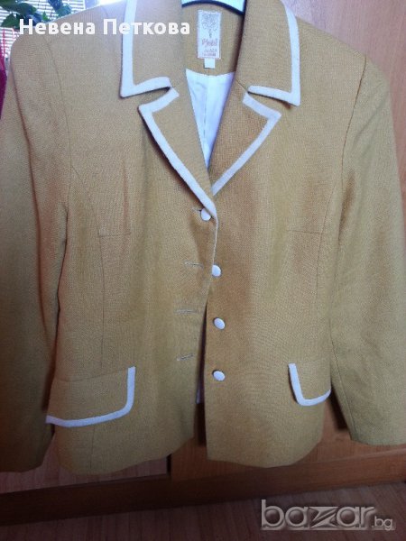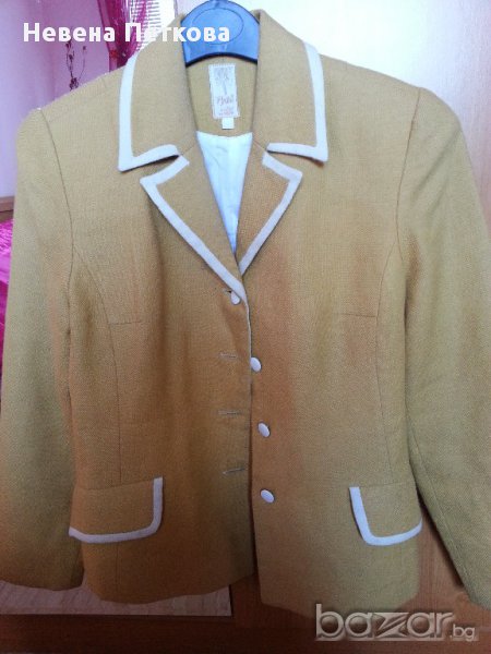 Дамско оригинално сако от вълнен плат, с подплата, наситен жълт цвят с бели ивици на реверите, ръкава и джобовете. Размер № 44-46 българска номерация. Имам и същата жълта вълнена пола с подплата, но е по-малък размер, затова я предлагам отделно, вижте в обявите ми. Изпращам с куриер с отстъпка, преглед и тест, или лично предаване в София.