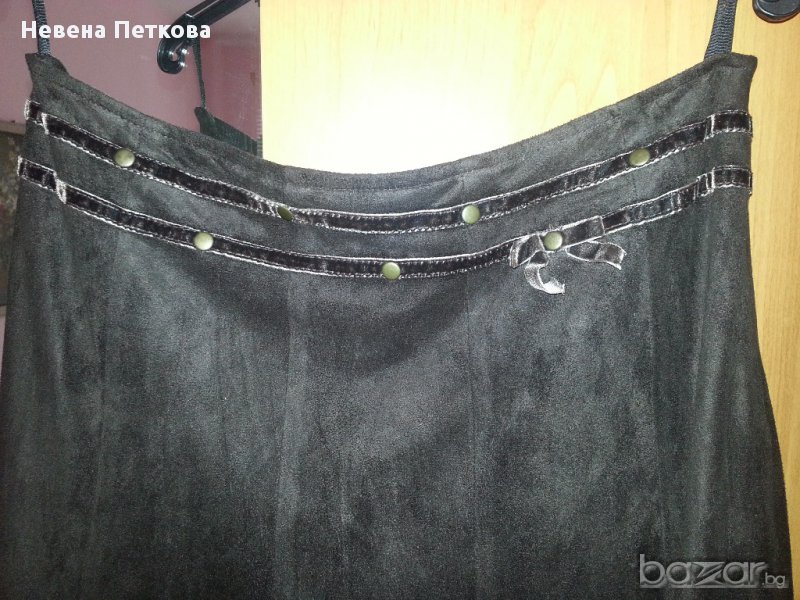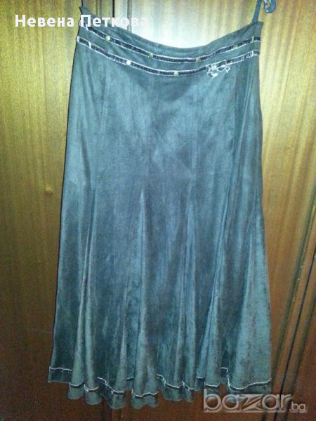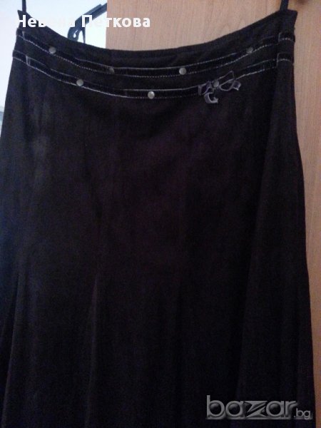 Продавам дълга леко разкроена пола Roberta, тъмно кафява на цвят - тънко гладко кадифе, с цип и с ширитчета около талията и долу по краищата на полата за украса. Размер М, около № 42-44-46 българска номерация /според фигурата/, талия 38 см /или обиколка 76 см/, надолу се разширява, дължина 86 см. Отговарям на съобщения тук, изпращам с куриер с отстъпка, преглед и тест, или лично предаване в София.