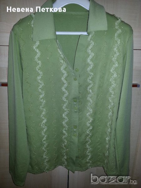 Блуза тип риза с дълъг ръкав с леко лъскави фигурки отпред, с копчета , светло резидава на цвят, № 44-46 българска номерация. Отговарям на съобщения тук, изпращам с куриер с отстъпка, преглед и тест или лично предаване в София.