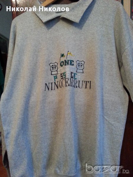 Мъжка спортна блуза Nino Cerruti с яка, дълъг ръкав, мека плътна материя памук, светлосив цвят с надпис отпред Нино Черути. Блузата е като нова, но има забележка на ръкава протрито, затова е запретнато - на снимката се вижда. Около № 52-54-56 българска номерация, ширина гърди отпред 60 см или 120 гръдна обиколка подмишница, рамене 64 см, дължина 70 см, ръкав 56 см. Отговарям на съобщения тук или т.0887780808, изпращам с куриер с отстъпка, преглед и тест, или лично предаване в София.