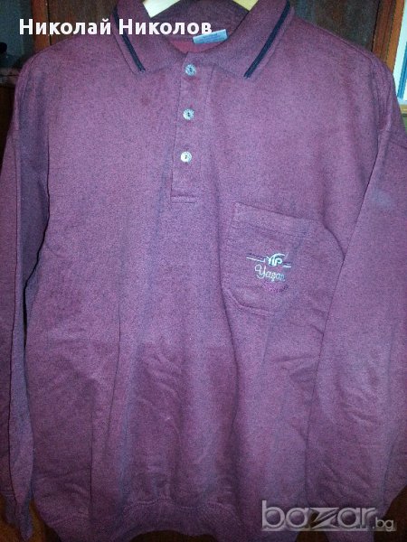 Мъжки пуловер с яка и 3 метални копчета, тъмночервен цвят. Размери XL-2XL, рамене 56 см , гръдна 60 см или 120 см обиколка, дължина 70 см, ръкав 57 см. Мека материя 100 % памук. Отговарям на съобщения тук, или т. 0887780808, изпращам с куриер с отстъпка, преглед и тест, или лично предаване в София.