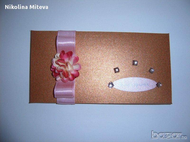 Дизайнерски кутийки, ръчна изработка подходящи за за поставяне на пари за подарък. Всяка кутийка е уникална.Ако искате сами да аранжирате кутийката цената е 2лв. броя. Кутийките са в индивидуални найлонови торбички с цип и със залепващо тиксо от задната страна.