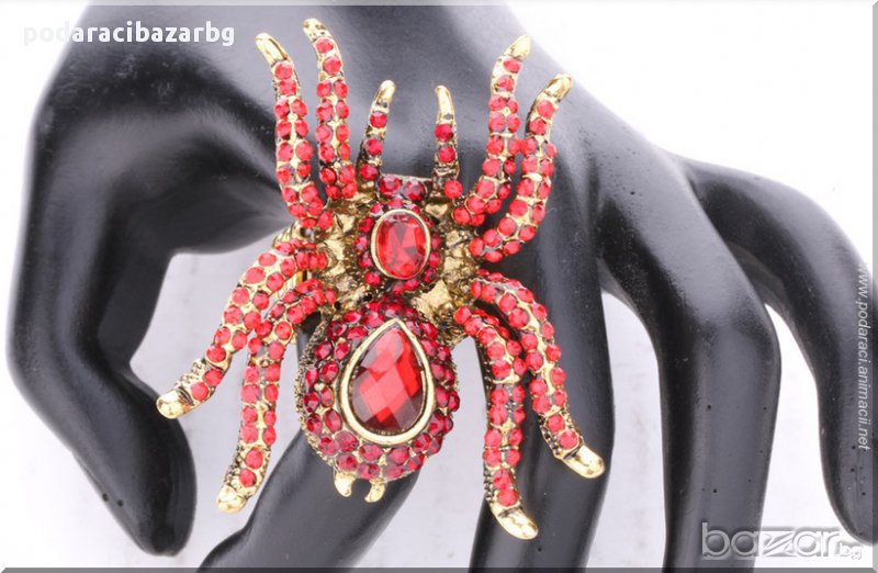 Пръстен с един истински голям паяк, блестящ от кристали, пречупващи светлината.Бижу за жената, която не пее старата песен „да е нежничко и семпличко...”, а следи модата и знае, че в момента са актуални изключително обемни пръстени, които украсяват голяма част от ръката.Пръстенът с паяк се предлага в различни цветове, за да съчетаеш лесно с останалите си бижута и аксесоари.Наличен е със сребърна основа и лилави акрилни камъни, златна основа и червени камъни, както и многоцветен със златни метални части.За многоцветния вариант трябва да отбележим, че и двата големи централни камъка са в розово-лилав цвят.Разгледай снимките и избери своя паяк, който ще полази ръката ти, шашкайки приятели и непознати;)Моля, при заявка посочи кой вариант да ти бъде изпратен.