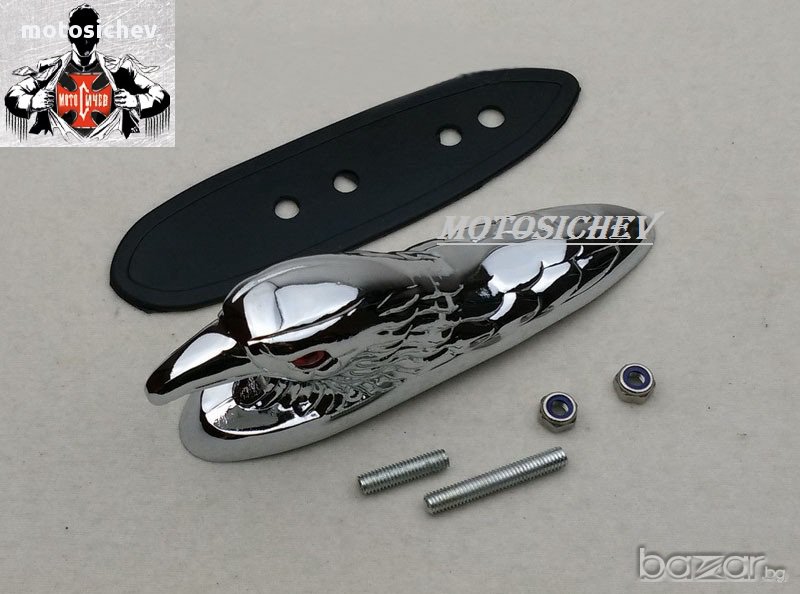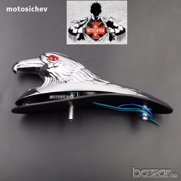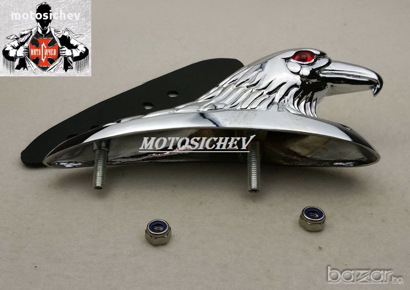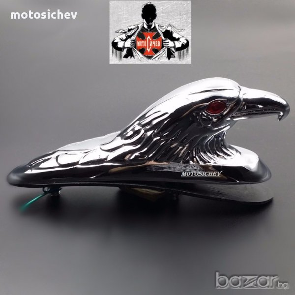 Хромиран метален орнамент - глава на орела със светещи червени очи - лед светлина