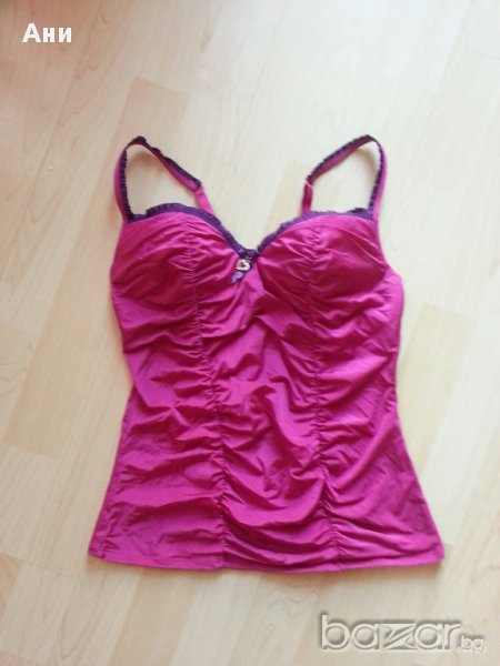 Страхотно бюстие в наситен розов цвят.С вграден сутиен е.Горната част е обкантена с лилаво,а между чашките има сърце с камъни.Не е обличано,само етикета е махнат,затова съм писала състояние ново.Размер С/М,чашка Б/Ц._ _Размери:дължина 52 см,ширина 34 см._ _*Разгледайте и другите ми обяви,има много дамски дрехи!_