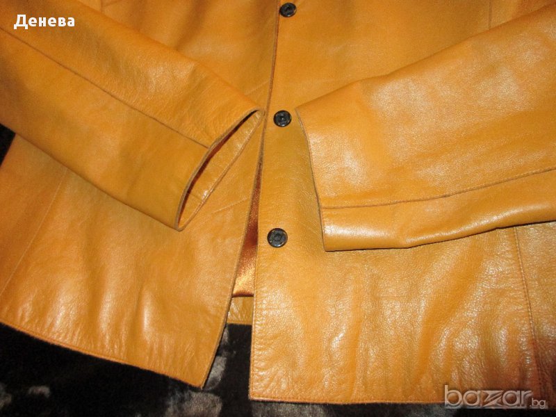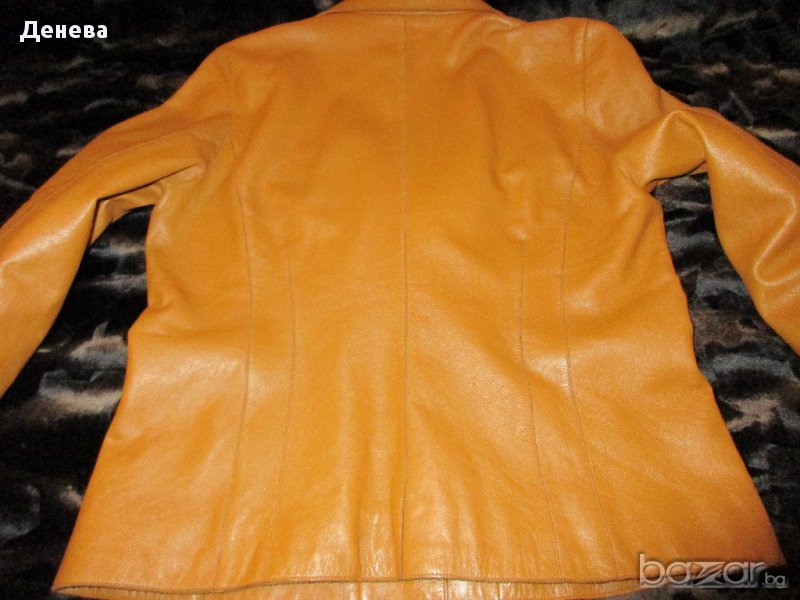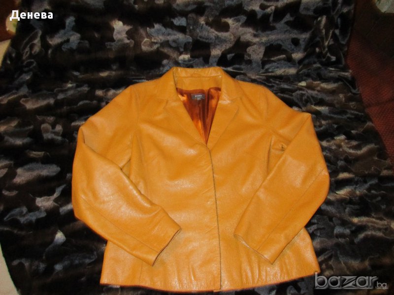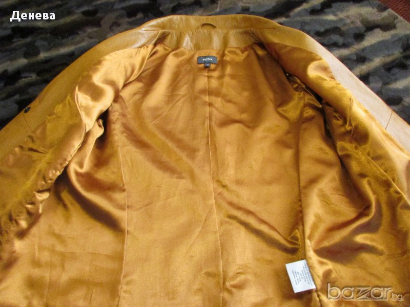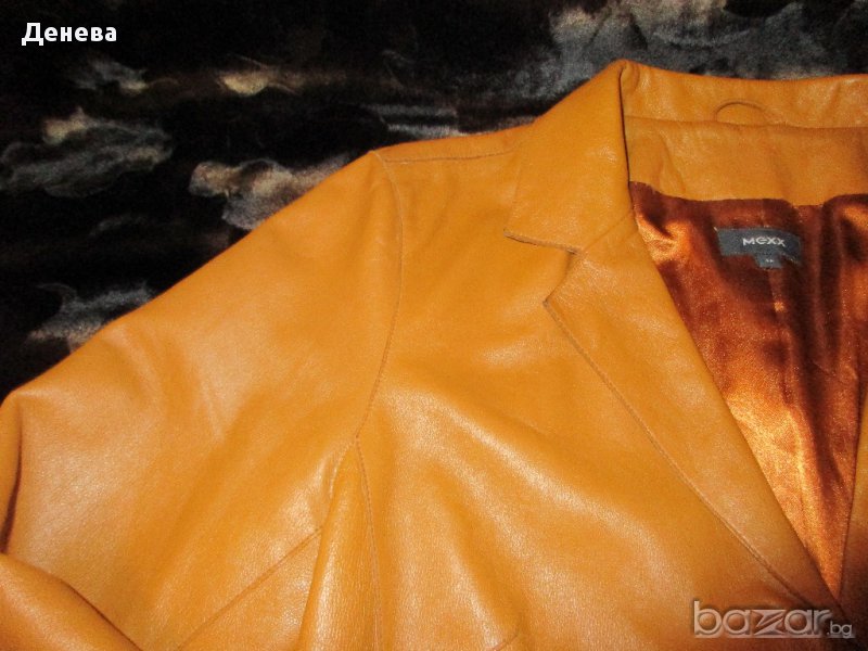 Дамско кожено сако на MEXX със скрито закопчаване отпред, 44 размер по етикет, вталено на гърба с двойни пенсове. РАЗМЕРИ - гръб от рамо до рамо - 45см., дължина на ръкава от рамото до долу - 66см., талия - 98см., гръдна обиколка 108 см. Без забележки!