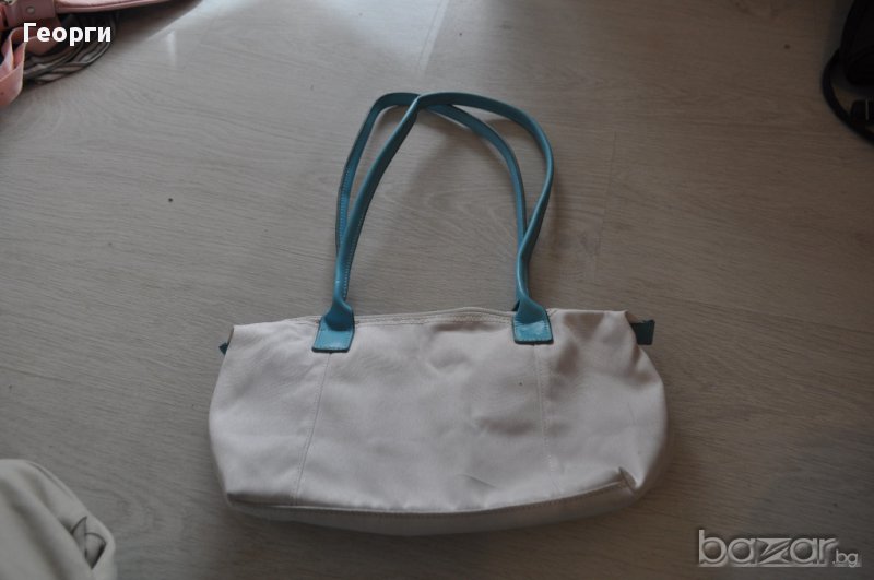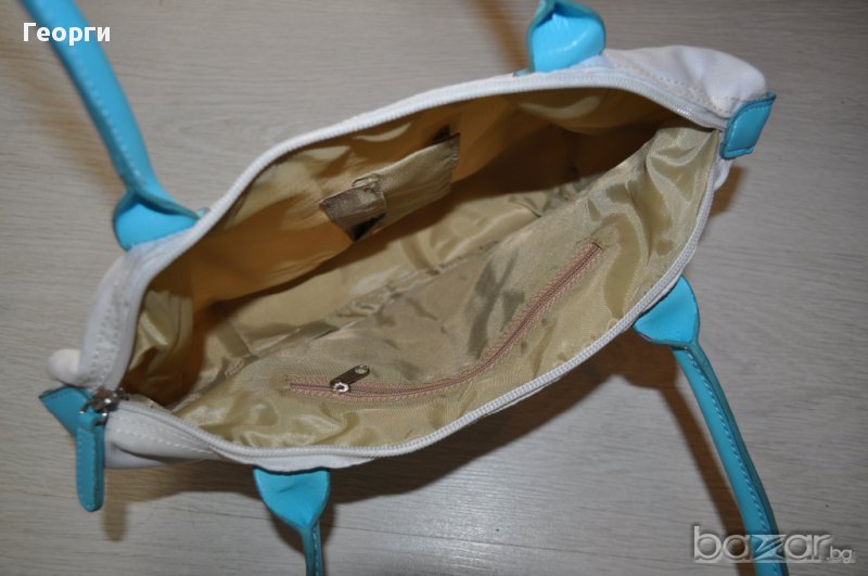 Продавам неизползвана бяла дамска чанта със сини кожени дръжки.