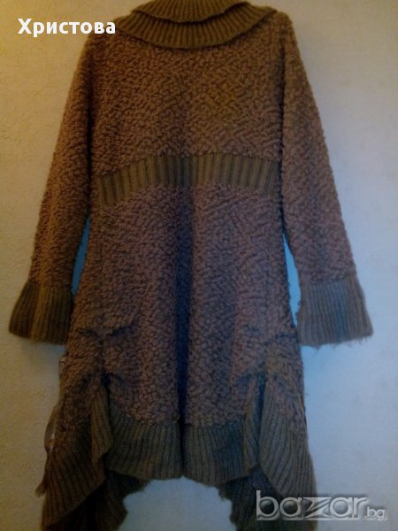 Дълга жилетка от бежово меко букле ,богато декорирана с фино плетени къдри по цялата дължина отпред и по яката.Закопчаването е със скрити кукички.Дължина отпред 113 см,отзад 88см,бюст 90см(прибл.,тъй като плетивото позволява разтегляне.Дължина ръкав 61см,от рамо до рамо 36см.Без забележки.