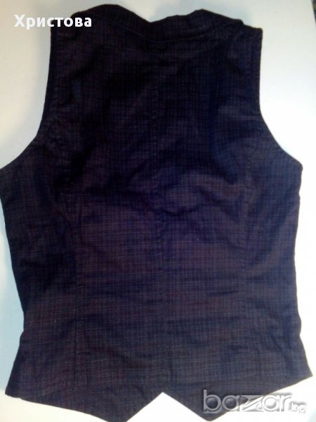Черен дамски елек от плътна памучна материя,с много дребно каре от сиви черти.Дължина отпред 51см,отзад 48см,бюст 78см,талия 70см.Размер S.Обличан веднъж.