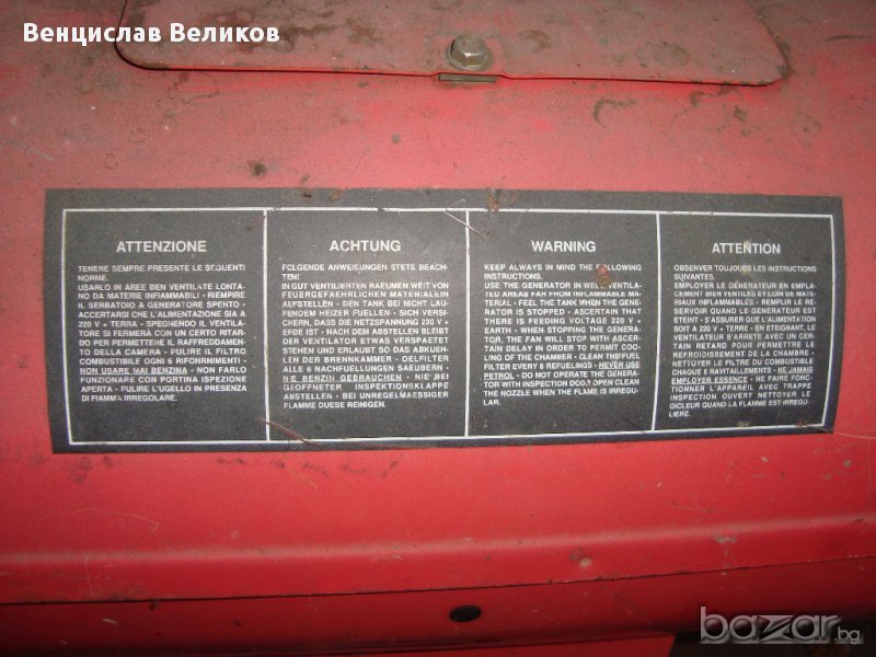 Нафтова горелка за отопление на големи помещения - индустриални или други.Има вентилация на 220 В.Мощност 50 кВ.Подходяща за отопление на цехове, халета, оранжерии, работилници,строежи, складове и прочие.Горелката е Италианска. - заводско изпълнение.