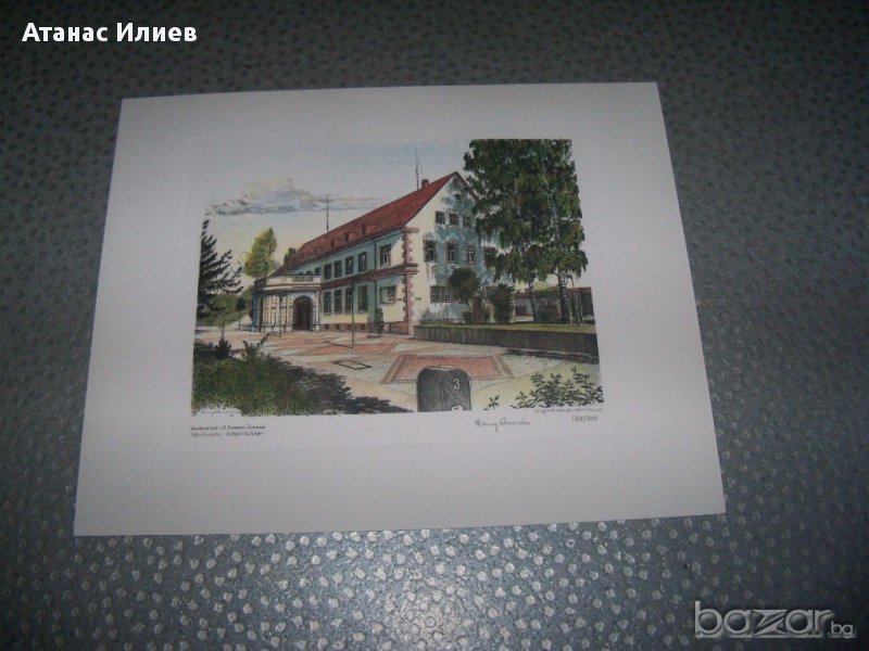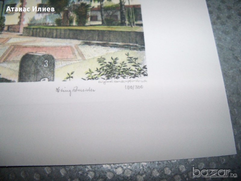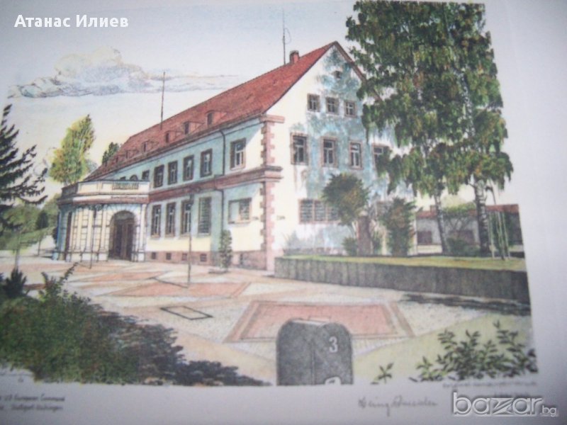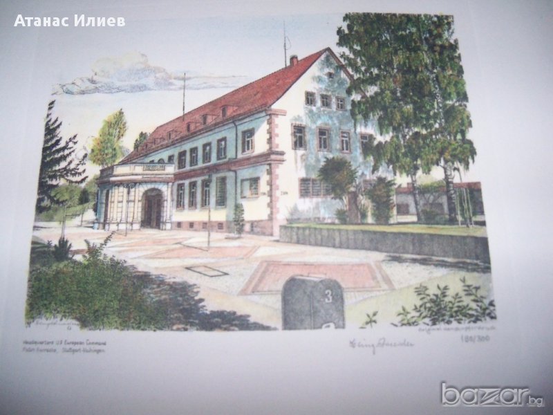 "Headquarters US European Command" - "Седалище на американското командване в Европа", гравюра отпечатък от медна плоча, има надпис на немски - original handkupferdruck . Гравюрата е подписана и номерирана като 190-та от общо 300 отпечатани. Гравюрата е с размери 30х23 см.