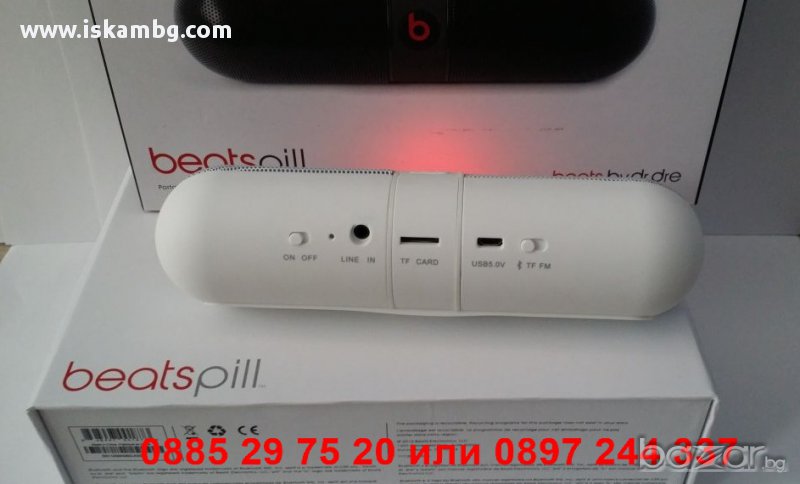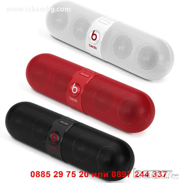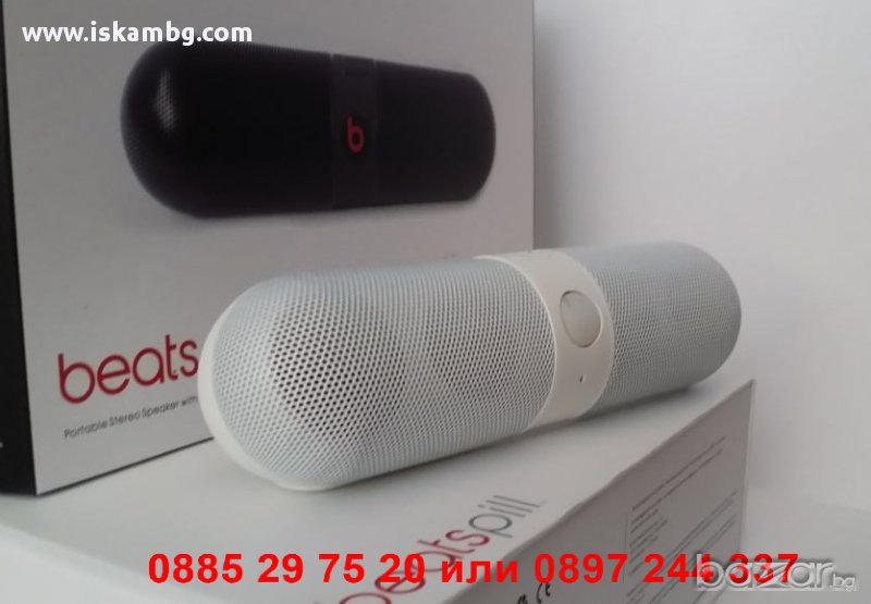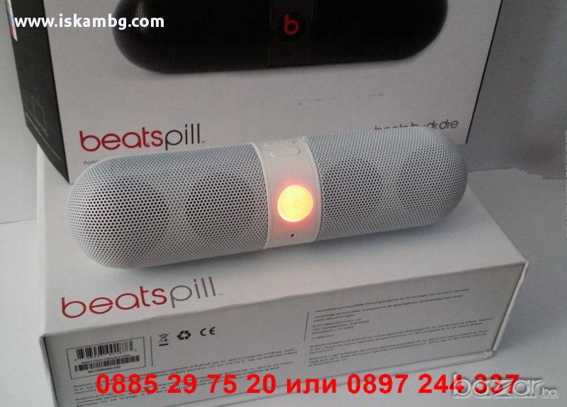 Bluetooth колонка Dr.dre Beats Pill. Обхват: до 10 метра. Поддържа SBC, APT-X и AAC Bluetooth, което означва че ще получите доста по-качествен звук от всяко едно друго Bluetooth устройство. Може да сменяте песните директно от вашия iPhone, мобилен телефон, лаптоп или друго устройство с Bluetooth. Вграден микрофон за безжични разговори. Line out за свързване с външни систем. Aux input за свързване с устройства с 3.5 мм аудио кабел. Мощна и точна аудио технология за максимален звук с минимално изкривяване. Подсилен и портативен дизайн Работи с презареждаща се литиево-йонна батерия (вградена) или с ток от ел. мрежа. Зарежда се лесно с USB кабела в комплекта. Вграден микрофон за безжични разговори. Налични цветове: Черен, Червен, Бял. Комплектът съдържа: Beatbox™, Pill аудио система, USB 2.0 кабел, 1.5 m аудио кабел (3.5mm към 3.5 mm), Захранващ кабел.