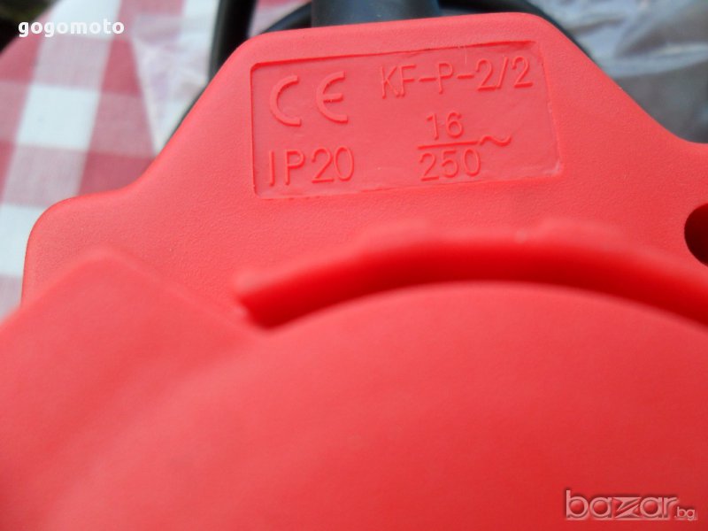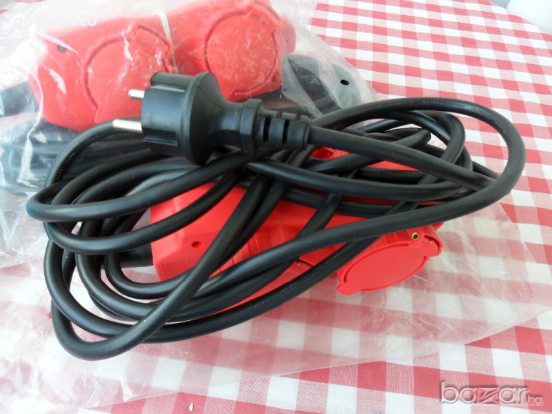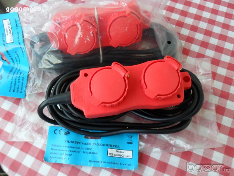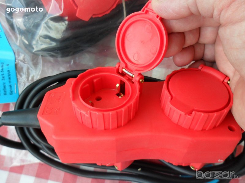 удължител НОВ, универсален, с 4 бр. контакти тип шуко, гнезда защитени с капаци, дължина на кабела 5 м., контактите, гнездата са разположени срещуположно 2 х 2,. 16А / 3500 W.