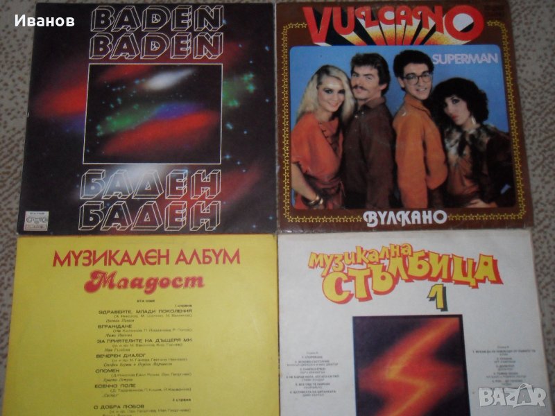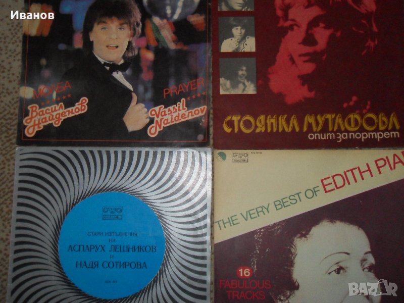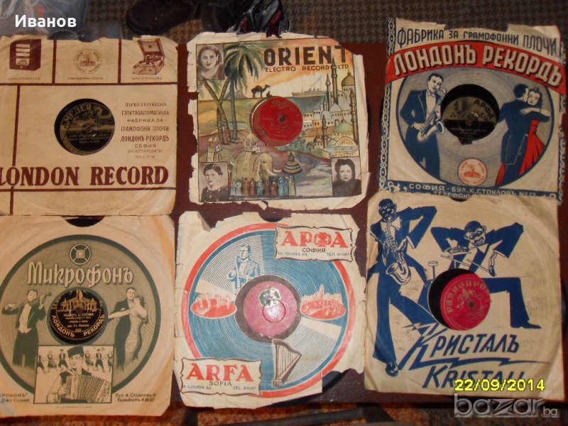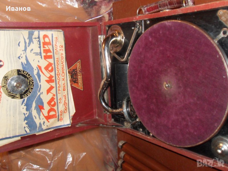 Продавам ръчен грамофон с автентични плочи за него - модел 1937г. Плочите са на 78 оборота и цената им е 10лв. на бройка.Грамофона е в изправност и е в много добро състояние!Освен това разполагам и с по-новите плочи-тези дето са на ток и са 33 оборота.Плочите са от големите/от двете страни по 6 песни-общо 12/ .Цената им е по 5лв.на плоча.Освен тези от снимките имам и много други-просто ако се интересувате пишете от какво и ще Ви отговоря има ли е в наличност.