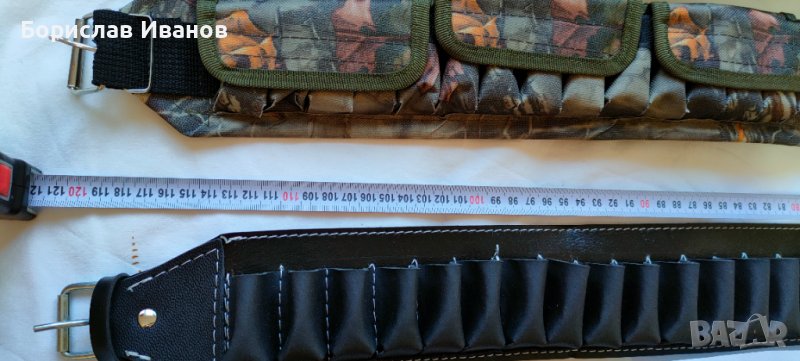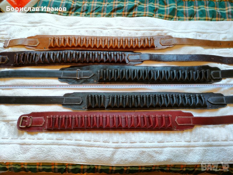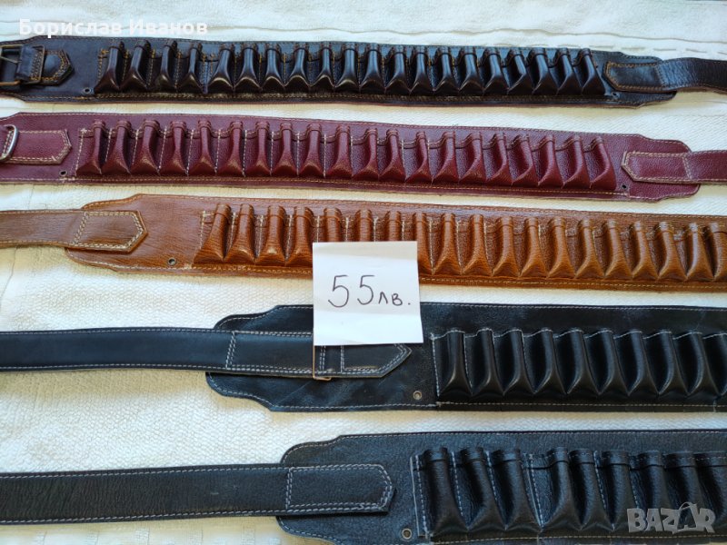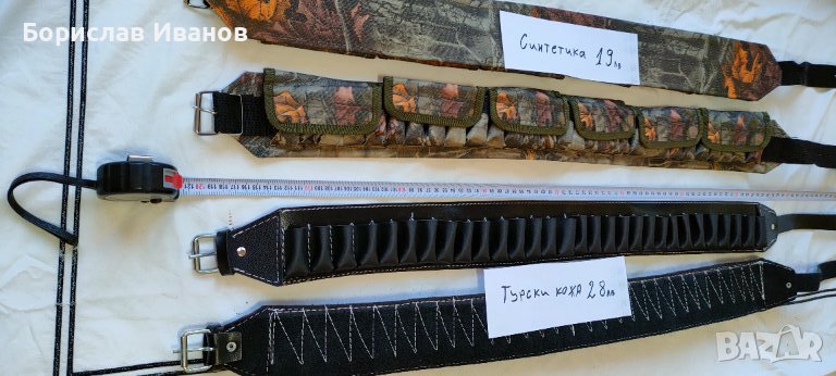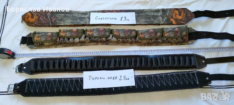 Патрондаж камуфлажен турски 122см. цетата е 18 лв.Модела кожа турски на цена 28 лв. Естествена кожа Български 20 патрона-135--140 см.55 лв. 30 патрона 65 лв. .И пластмасов турски с 30 патрона и 120 дължина на 16 лв.