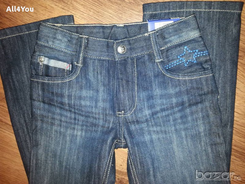 Нови дънки размер 116см. Нови и с етикети. С висококачествен цип YKK.Ширина 28.5см., дължина 70см. цялостно и 50см. от чатала надолу. С вътрешен колан с ластик и копчета за регулиране на ширината в кръста.