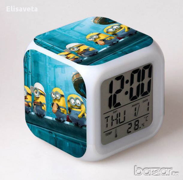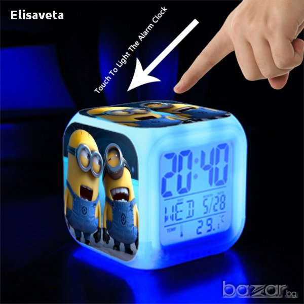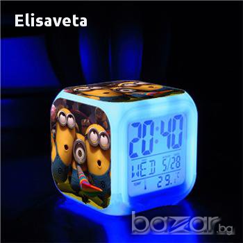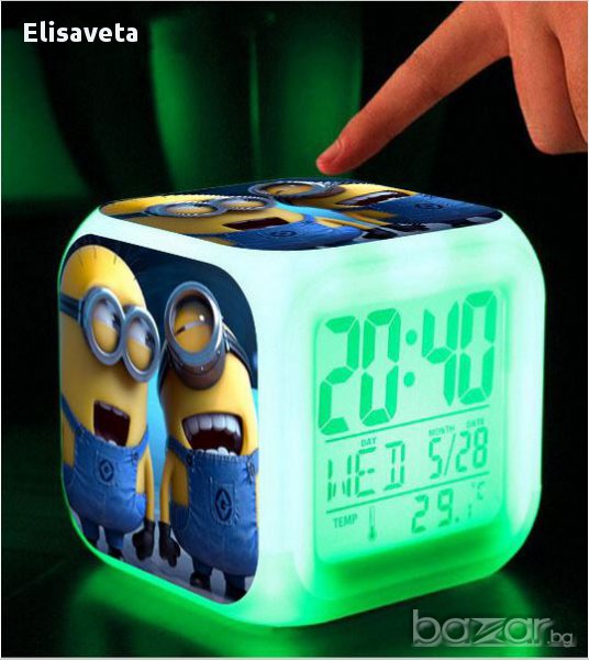 Чисто нови страхотни LED часовници с любими детски герои миниони от Аз проклетника (Despicable Me) или Замръзналото кралство. Светят ярко и красиво в различни цветове. Включва се с едно докосване от горната страна на часовника, като така лесно може да се види през нощта колко е часа, да се намери чашата с вода или шишето на бебето. Също така може да се пусне и в режим да свети цяла нощ и така детето ще заспива спокойно и няма да го е страх от тъмното или можете по всяко време да наглеждате бебето без да палите лампа. Работи с 2бр AG13 батерии за часовника и термометъра (включени в комплекта) и 4бр AAA батерии или AC адаптор/кабел за функцията светене (не са включени в комплекта). Страхотна идея за подарък.