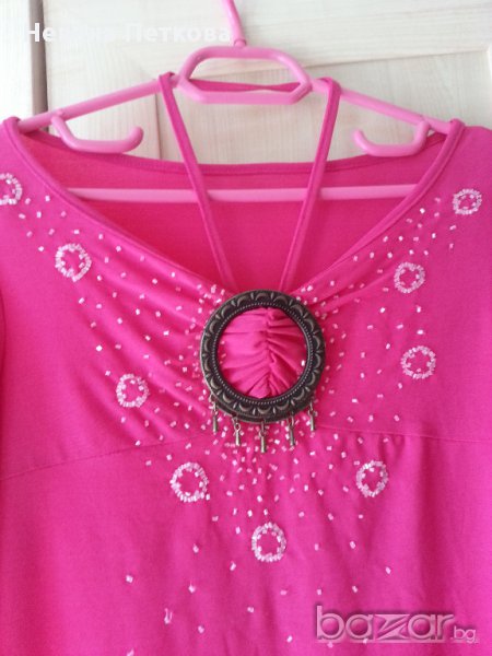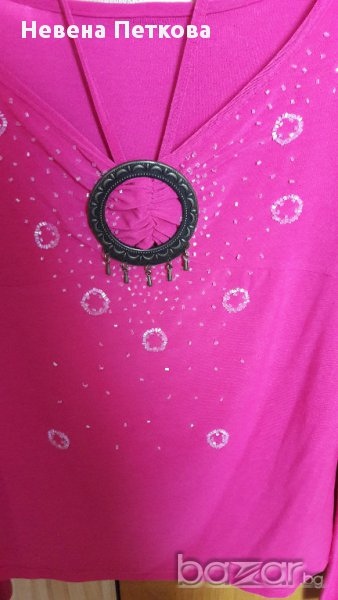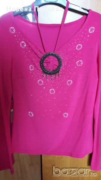 Дамска луксозна блуза с дълъг ръкав, цвят цикламено розов, тънка еластична материя, с бели мъниста на фигурки и метална тока отпред с допълнително държаща презрамка около врата. Размер М или №42-44 българска номерация, бюст 40 см отпред и се разтяга до 46 см, талия 38 и се разтяга до 44 см, дължина 55 см, ръкав 61 см.