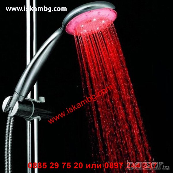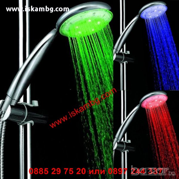Душ слушалка, която свети в зелено, синьо и червено според температурата на водата.