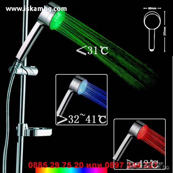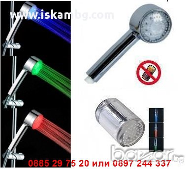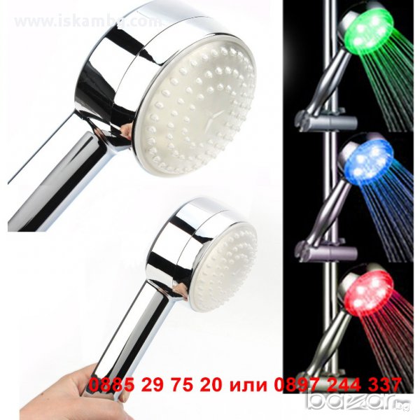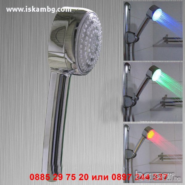 Душ слушалка, която свети в зелено, синьо и червено според температурата на водата.
