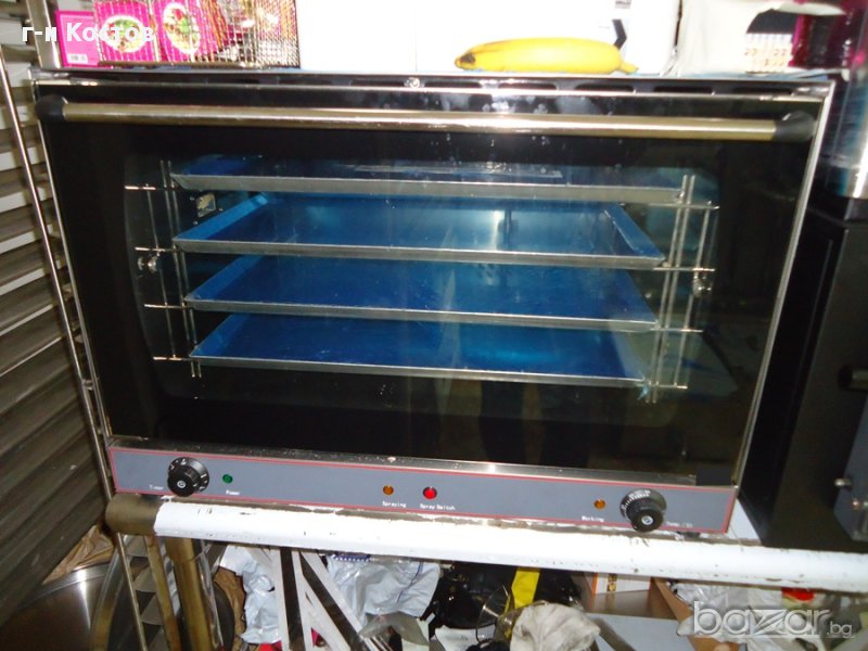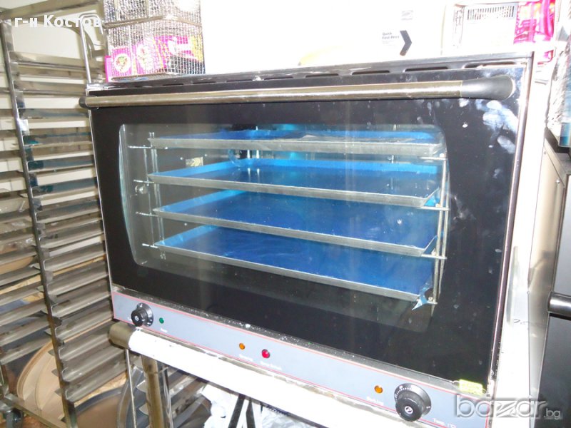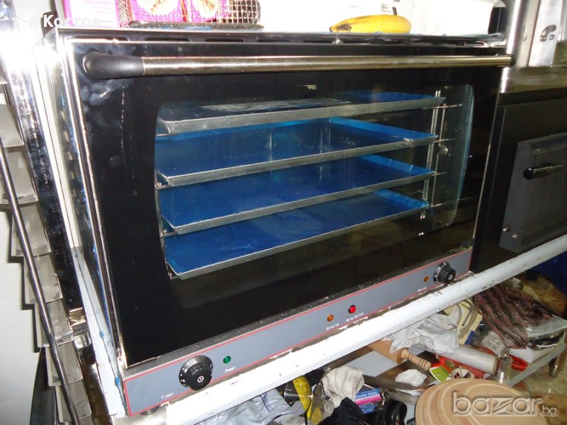 2.Конвектомати Нови за закуски и готвене за 4бр. тави 41.5см./31.5см. и впръскване на пара, размери на тавичките 41.5см./31.5см., температура : 0-320° С,Мощност: 2670W + 2000W, 220V/50Hz/1PH ,външни размери широчина от ляво на дясно 60см., височина 58см., дълбочина 56см.,/ 1 година гаранция /…