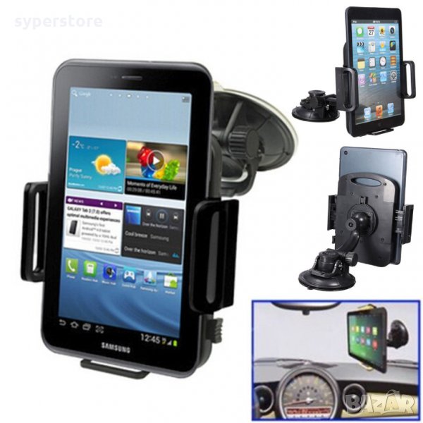 Стойка за Таблет за кола 7-10.1" TS0005 TAB+D Holder for tablet for carУниверсална стойка за автомобил подхояща за таблет, фаблет, голям смартфон, GPS, PDA и др., за устройства с ширина от 7 до 10.1" , захващане към стъклото на автомобил ,завъртане на стойката на 360 градуса,регулиране на дължина , широчина, височина и наклон,омекотени зони на захват, предпазващи устройството,лесен монтаж и демонтаж // UNIVERSAL TABLET,PDA / TELEPHONE CAR HOLDERUniversal holder for Tablet PCMulti direction standComfortable fellShock resistanMade with cushionsSlip resistant designХарактеристики:* Универсална стойка за автомобил, за таблети, GPS, ТV, и всякакви други устройства с размери, съгласувани с параметрите и.* Задържащия механизъм е с плавна механика, която се настройва за размери от 7 до 10.1".* Възможност за ползване на бюро, мебели, прозорци и всякакви други гладки повърхности.* Стабилно захващане, с умекотени зони, включително и за гърба на устройството.* Подсилен вариант с перфектна устойчивост и стабилност.* Възможност за триизмерно, 100% завъртане до 360 градуса.* Изработена от високачествена пластмаса.* Качествен елемент за вакуумно залепване към стъкло.* Омекотени зони на захвата, предпазващи устройството от надраскване, както и мека зона на гърба на устройството.Цвят - черен