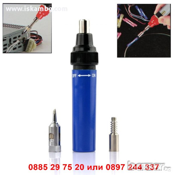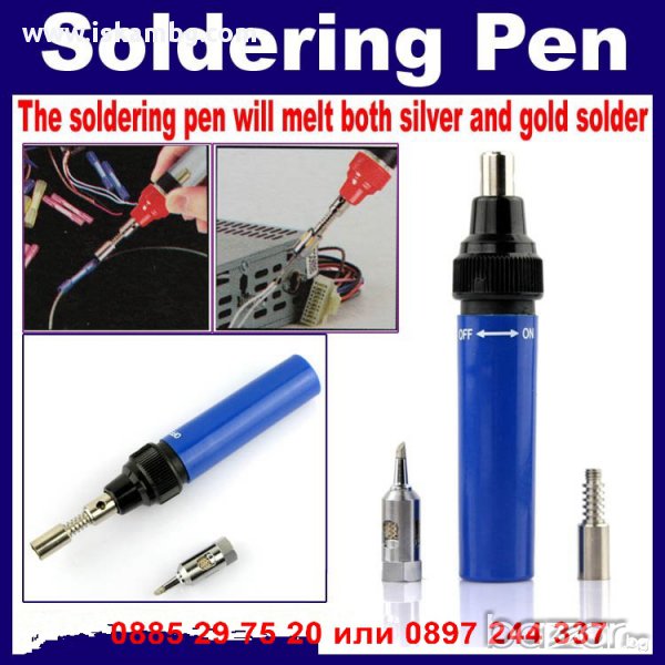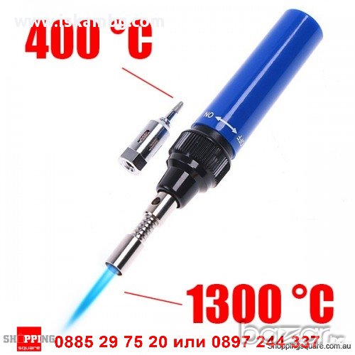 газов поялник е с автоматично стартиране/запалване на газта/ - мощност,приравнена към електрическите - 100W. Температура на върха на "човката" варира от от 250 до 500 градуса , достатъчна за работа с твърди прибори.