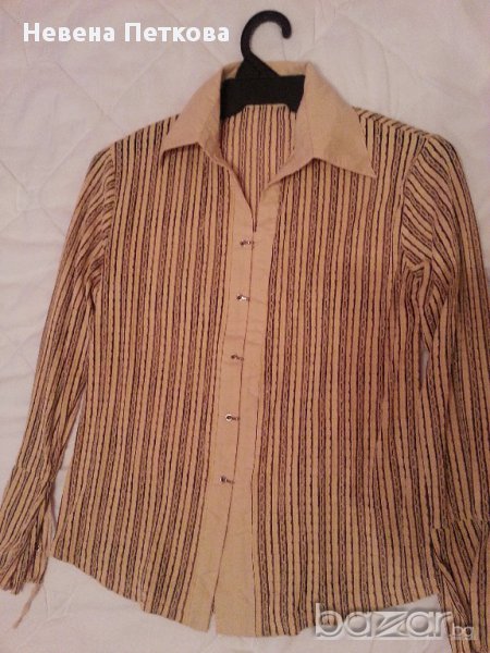 Дамска риза на райета с интересно закопчаване, светлобежово на цвят на ивици, около № 44-46. Отговарям на съобщения тук, изпращам с куриер с отстъпка, преглед и тест, или лично предаване в София.