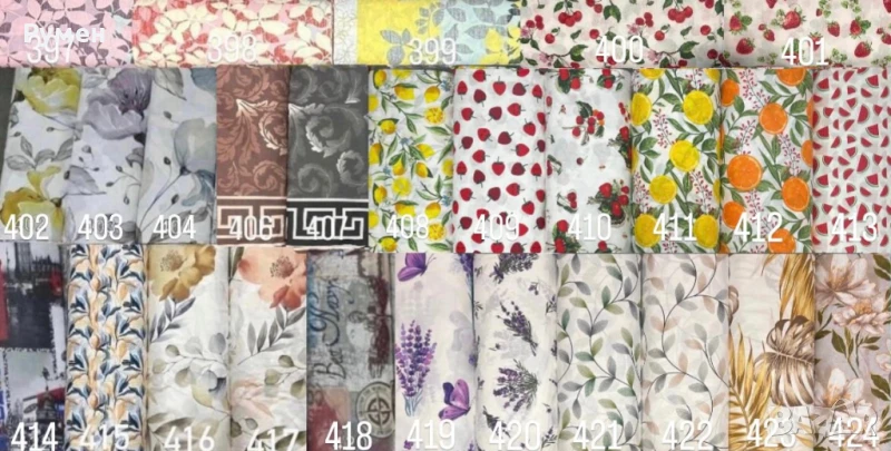 Десените с №300 до 424 са ранфорс 100% памук 6.99 лв /метър ширина 240см