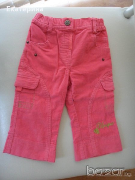 Дължината може да се коригира с подгъва, който е доста висок (сн.1 и 2). По етикет са за 86 см, стават и за 80 см, ако е по-пълно детето. Имат 2 джобчета отстрани и копче, вграден ластик на талията. Цветът е между розово и червено - корал, диня, както искате :).