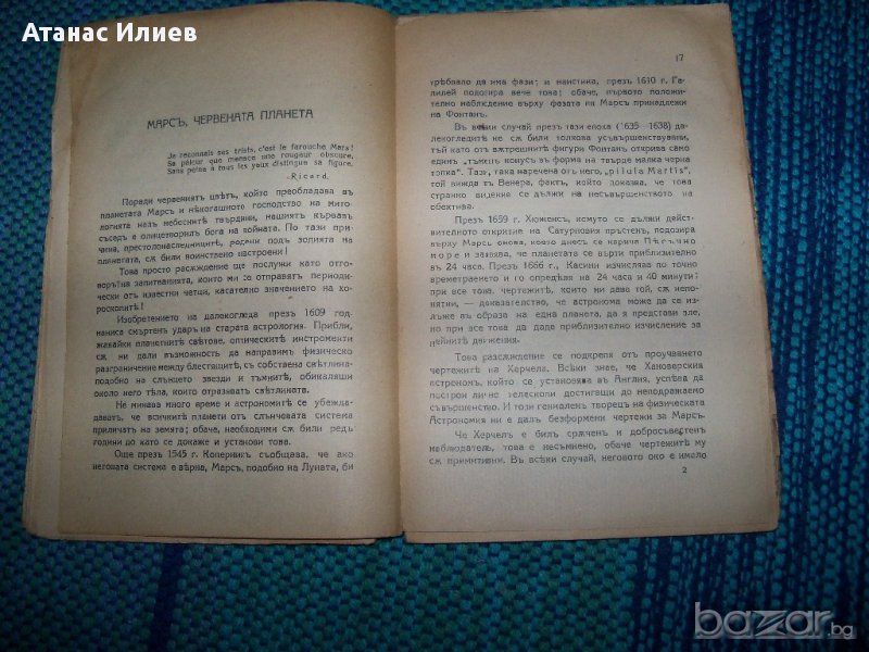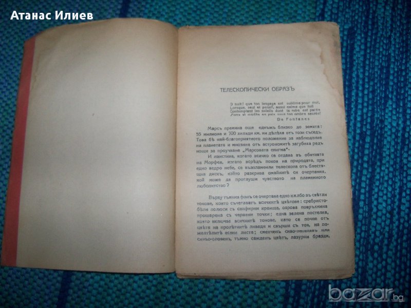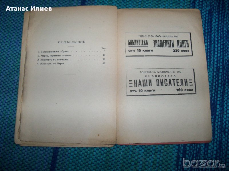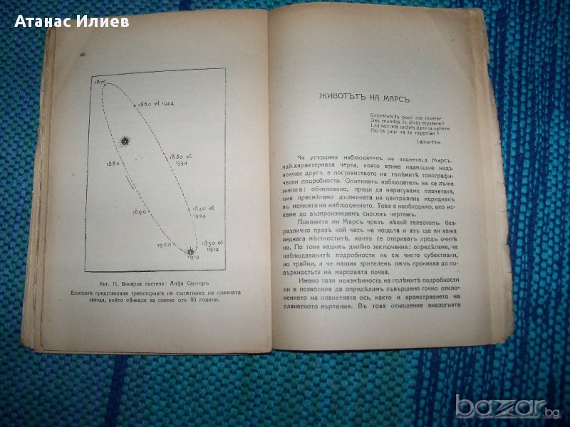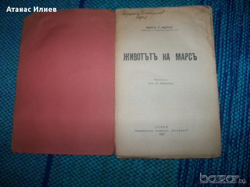 "Животът на Марс" от абат Т. Морьо, директор на Буржската обсерватория. Книжката е издание 1928г. на библиотека "Знаменити книги". Книгата е с меки корици, 62 стр. с 14 фигури в текста. Книжката съдържа разделите: Телескопически образ, Марс червената планета, Животът във Вселената, животът на Марс.