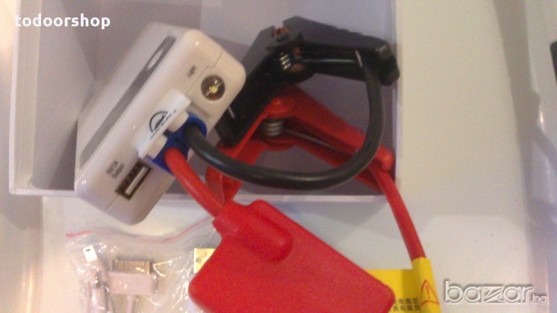 В комплекта има щипки за стартиране на автомобил, универсално зарядно за телефони (mini USB, micro USB, iPhone 4,5,6 букса), зарядно - 220V.