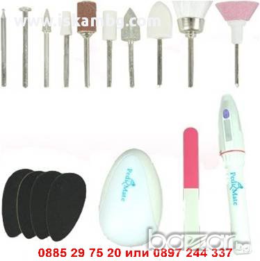 • 10 приставки за оформяне на ноктите: диск от син камък – за изпиляване на ноктите до перфектност, приставка конус за премахване на сухи кожички, сатенена четка за нанасяне на масла и кремове, приставка за полиране, конус за трудно достъпни ъгълчета и ръбчета, за фино пилене и т.н.