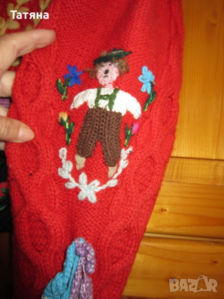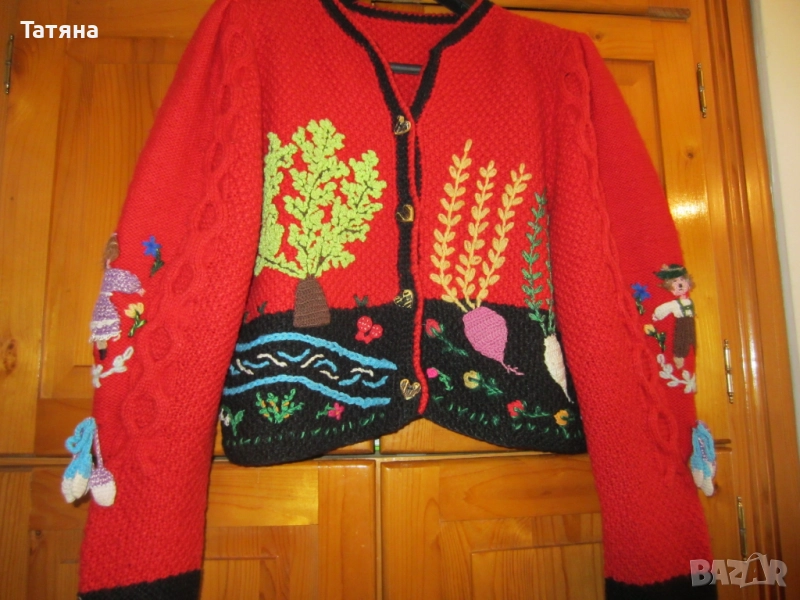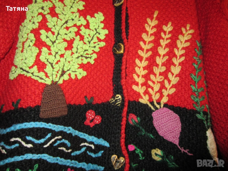 Снимка 1;4;5;6;Тази жилетка е ръчно плетиво ;Преждата е 100% Вълна; Изработена е по поръчка ;Вплетени много красиви етно елементи; Дължина -50см; Ръкав -65см;;гръдна обиколка -112см; Ползвана е за МОСТРА на етно ревю;Жилетката е къса като модел,защото идеята е да се ползва и като яке; ЦЕНА -80 €;