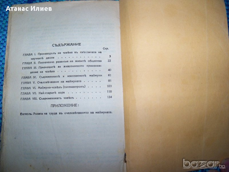 "Произход на човека" от Б. Вишневски с притурка "Ролята на труда в очеловечаването на маймуната" от Фридрих Енгелс. Издание на книжарница "Нов свят" София 1937г. Книгата е с меки корици 168 стр.