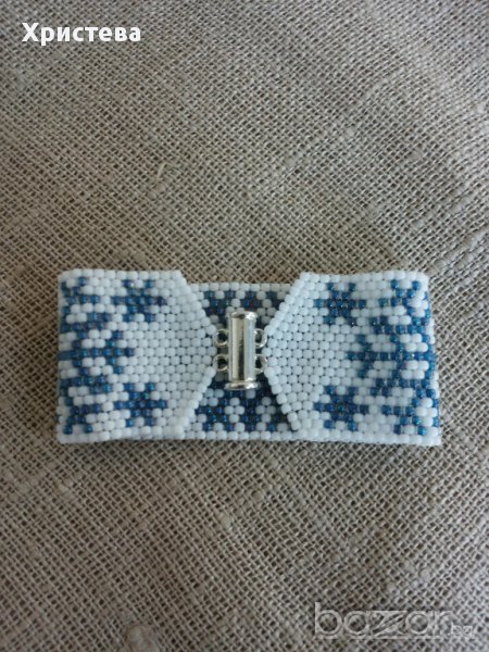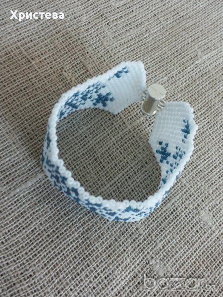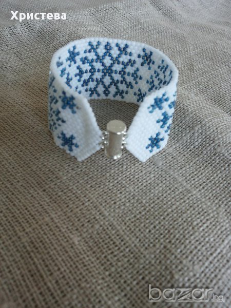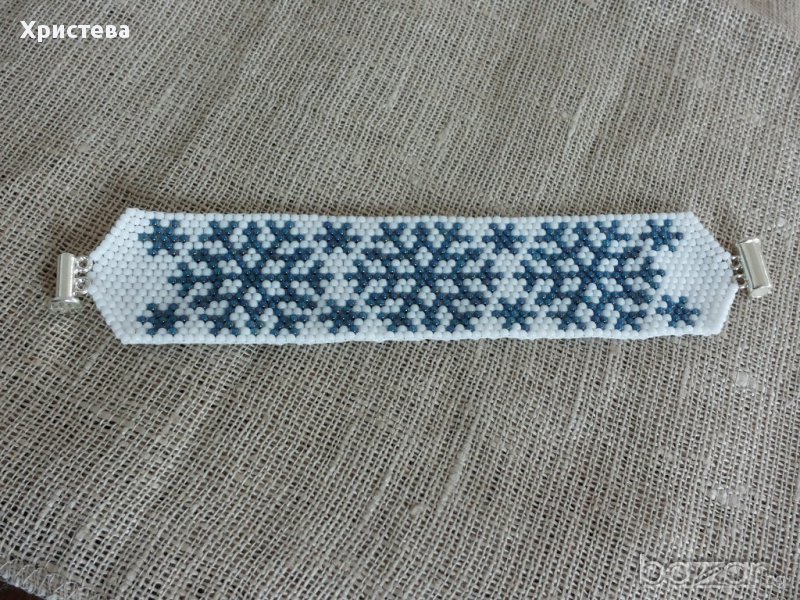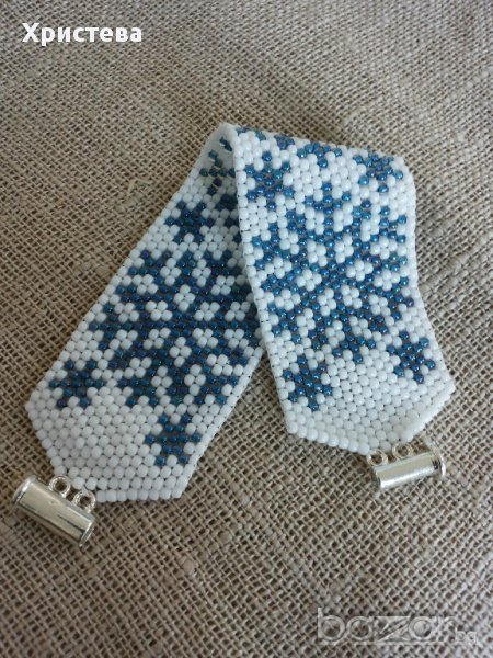 Гривната е изработена от мъниста тохо,с коледни/зимни мотиви-снежинки.Дължина на гривната 15,5 см.,ширина 3,2 см.,с метална плъзгаща закопчалка.