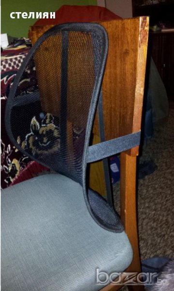 Държи кръста изпънат и така се избягват болките при дълго седене в колата или офиса.направена е от мрежест материал,което спомага за церкулиране на въздуха и се избягва изпотяването.облегалката е чисто нова.