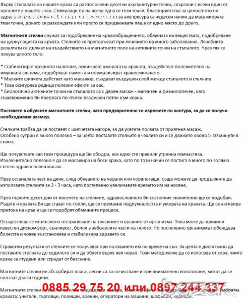 Магнитните масажиращи стелки са с широко лечителни резултати и се препоръчват при лечението на много заболявания. Въздействат на магнитното поле на активните точки на стъпалото за подобряване на кръвообръщението. Чрез тях се лекува цялото тяло. Биологично активните точки на стъпалото са с двоен масаж - магнитен и физиологичен, който предлага по-добър въздушен поток към краката.