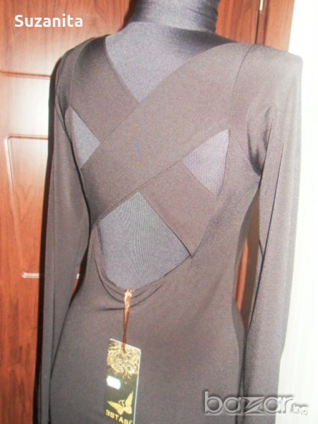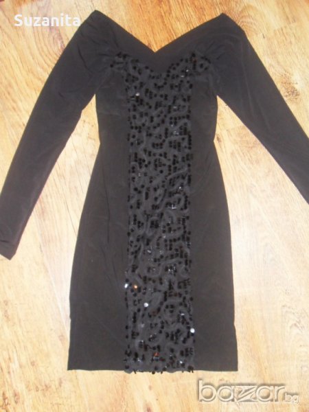 Официална дамска рокля - черна! Отпред с пайети, отзад - секси гръб! Прекрасна е! Размери на роклята: подмишниците: 84-104см, талия 76-96см, ханш 84-104см, дължина - 90см, дължина ръкав - 65см.