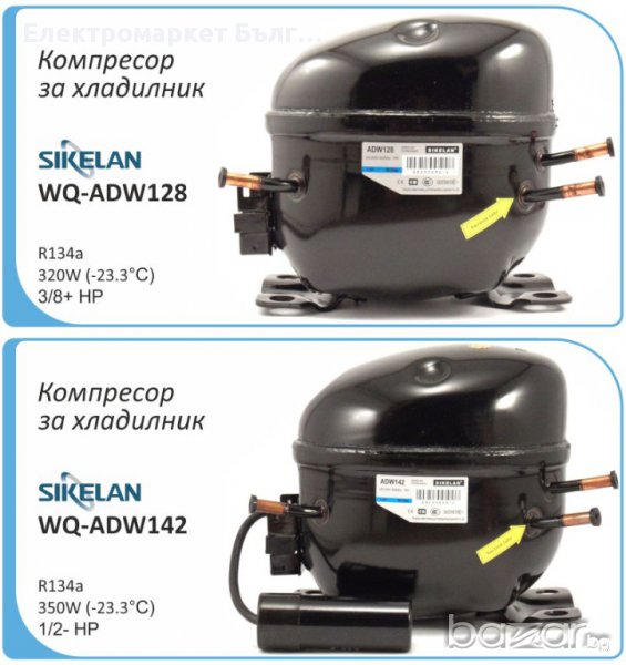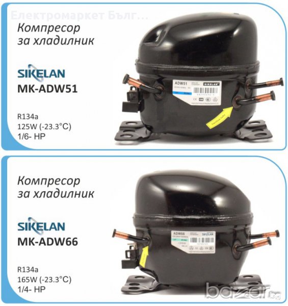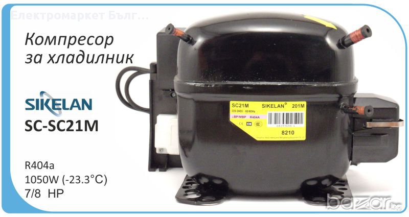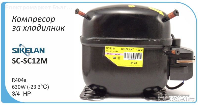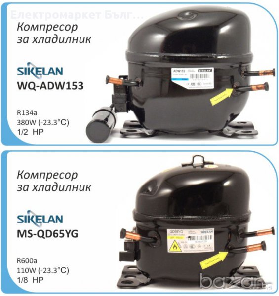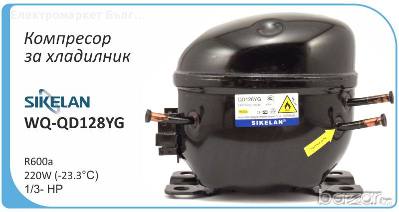 Компресор за хладилник Sikelan L-QD65YG, 110W (-23.3°C), хладилен агент R600a, подходящ за хладилник, фризер, хладилна витрина. Основни характеристики: малки габарити, висока ефективност, ниско ниво на шум, слаба вибрация, висока надеждност. Компресорът се доставя в оригиналната заводска опаковка.