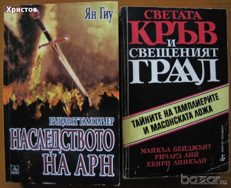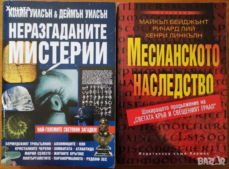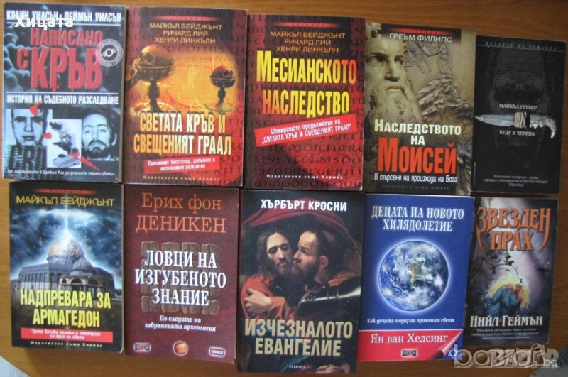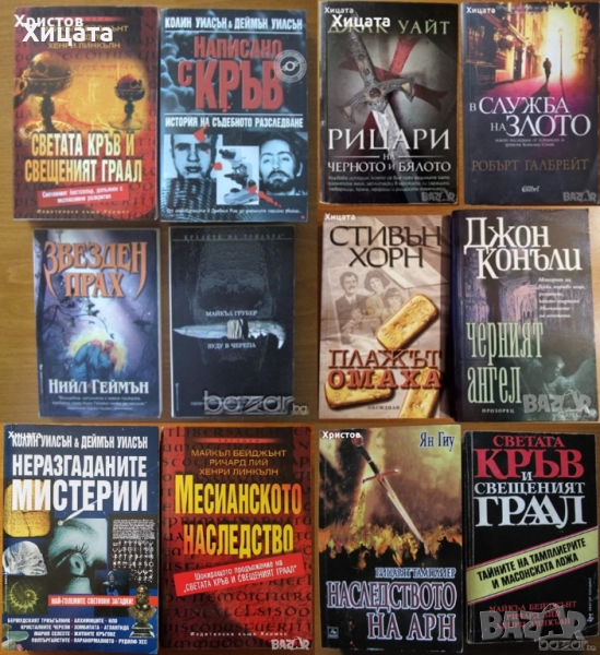 Написано с кръв.История на съдебното разследване,Колин Уилсън, Деймън Уилсън - 90лв;Неразгаданите мистерии,Колин Уилсън, Деймън Уилсън - 50лв.Звезден прах,Нийл Геймън - 50лв;Гангстерска икономика.Как организираната престъпност ни изкупува,Юрген Рот,Слънце,2010г.336стр. - 50лв. Руската мафия,Юрген Рот,Атика,1998г.256стр. - 30лв. Пътят на мафиота.Внедрен в мафията като Дони Браско,Джоузеф Пистоун,Световна библиотека,2004г.256стр.Отлична! - 50лв Светата кръв и свещеният Граал,Майкъл Бейджънт, Ричард Лий, Хенри Линкълн,Абагар Холдинг,1998г.528стр. - 30лв.Месианското наследство,Майкъл Бейджънт, Ричард Лий, Хенри Линкълн -50лв. Вуду в черепа,Майкъл Грубер - 50лв. Рицари на черното и бялото,Джак Уайт,Бард,2007г.592стр. - 60лв Плажът Омаха,Стивън Хорн - 45лв. Черният ангел,Джон Конъли - 50лв. В служба на злото,Робърт Галбрейт,Колибри,2016г.528стр.Отлична! - 20лв Изчезналото Евангелие,Хърбърт Кросни -50лв. Надпревара за Армагедон, Майкъл Бейджънт-50лв. Децата на новото хилядолетие,Ян ван Хелсинг-50лв. Наследството на Моисей,Греъм Филипс - 50лв. Конспирацията срещу Магдалина,Лорънс Гарднър,Хермес,2006г.400стр. - 50лв. Световна буря,Джеймс Лавгроув - 35лв.Равновесие на леда,Александра Маринина - 35лв. Орденът на асасините: Прозрение ,Оливър Боудън - 40лв. Най-големите лъжи в историята,Ха. А. Мелер - 50лв. Кралят-маг,Крис Бънч - 50лв.