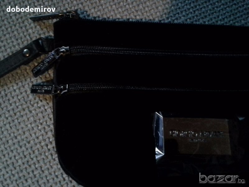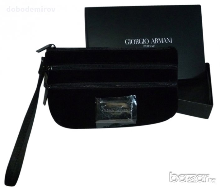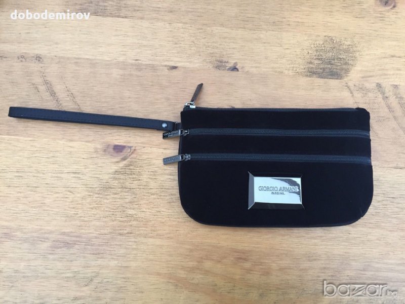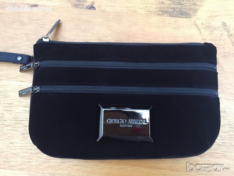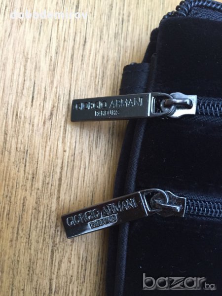 Елегантна Giorgio Armani вечерна чантичка от черно кадифе. Три отделения с цип с лого на всеки цип. Метална лого-плочка в предната част.