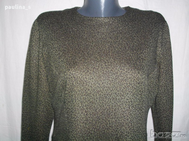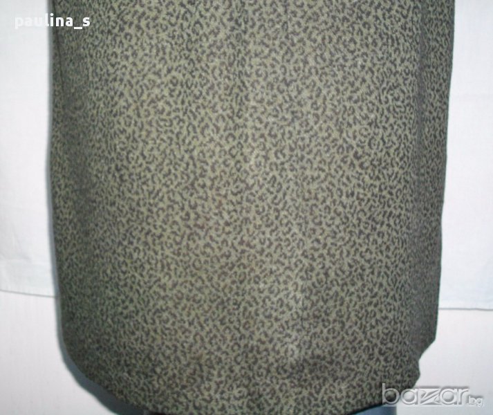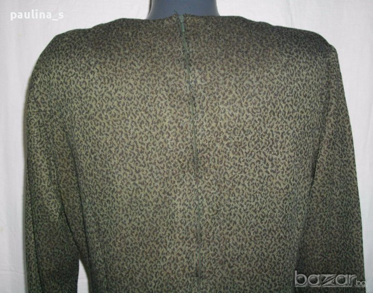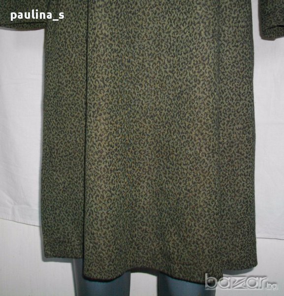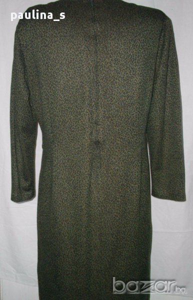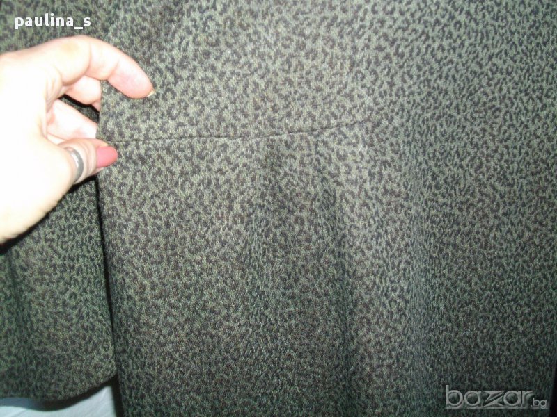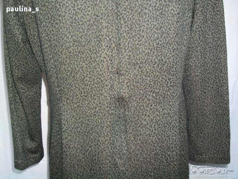 Уникална рокля с много елегантен, леко втален силует, в дискретен леопардов принт в зелено. Платът е вълнен с ангорска нишка и е леко пухкав. Отговаря на офис дрес-код или официално събитие! Хастарът е безупрeчен като и самата дреха!