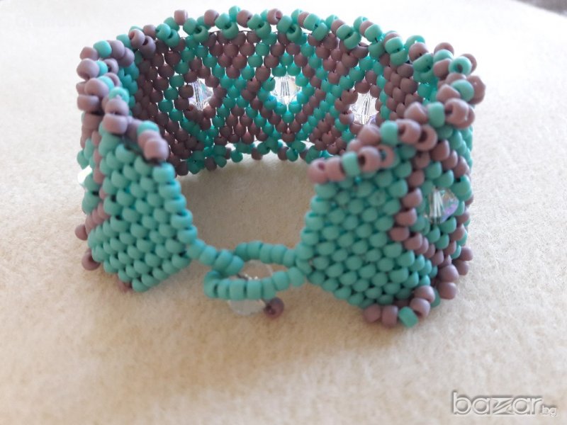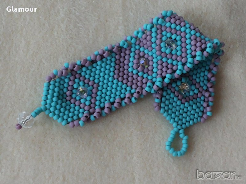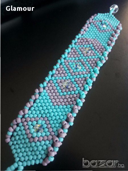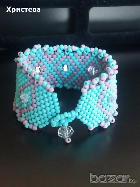Гривната е изработена от мъниста тохо в два цвята -лавандула и тюркоаз в съчетание с кристали.Дължина 16см.,ширина-3см.Плетка Пейот.