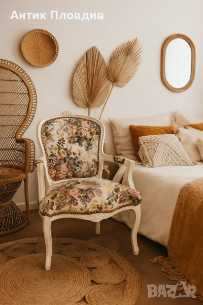 Изящно кресло с подлакътници, изпълнено в класически стил "Рококо"