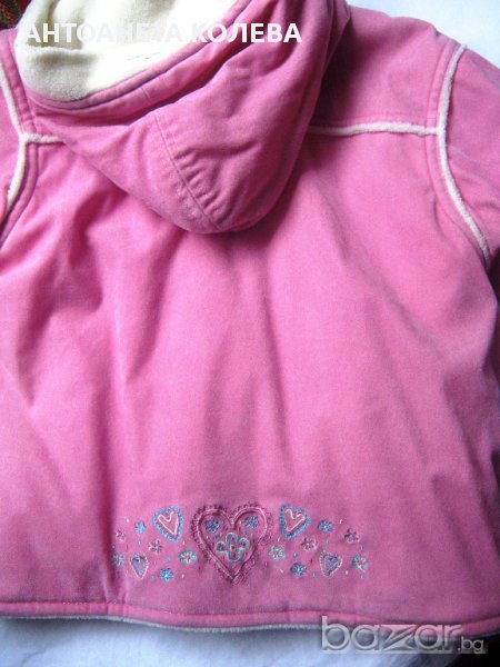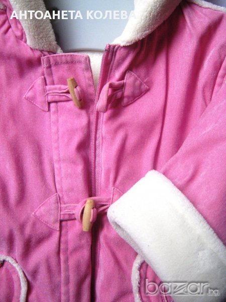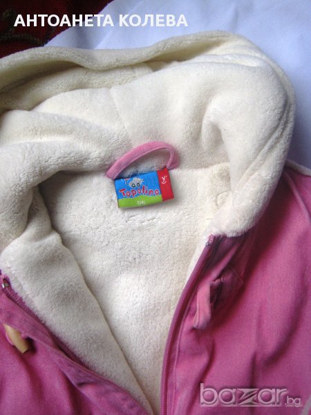Много запазен детски кожух, размер 86, приятно розов плюш с бродерия, отвътре мек и пухкав полар, ръкавите може да се обръщат, без никакви забележки, с качулка, на фирма Topolino,