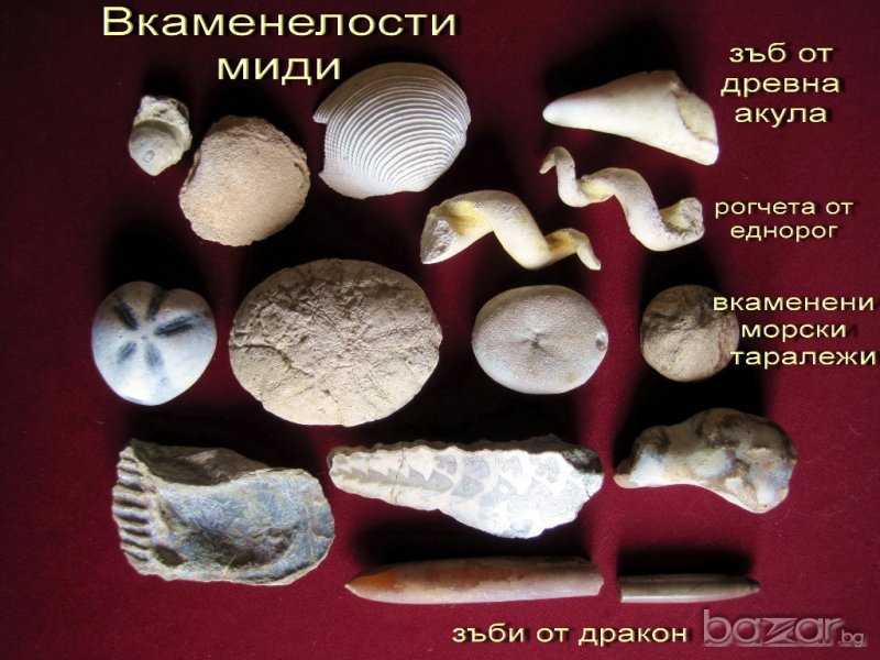 Рога от бик, рог, зъби от динозавър, акула, глави щука, вкаменелости, сепийна кост