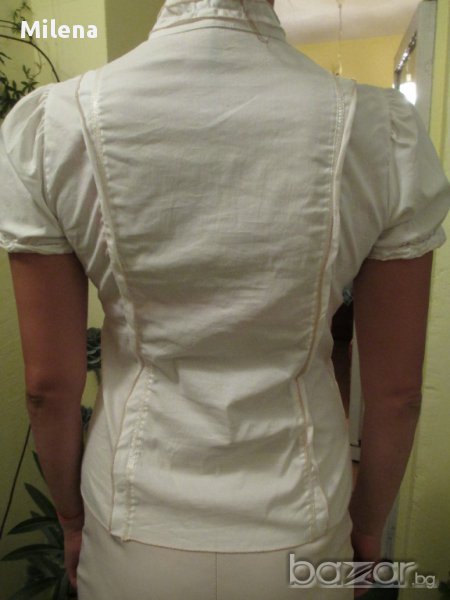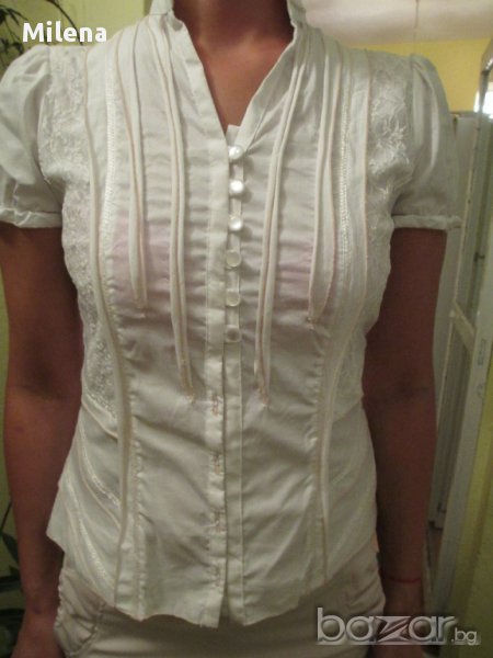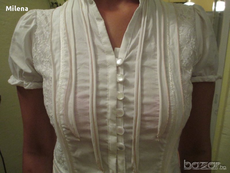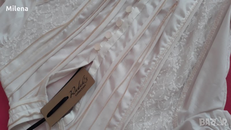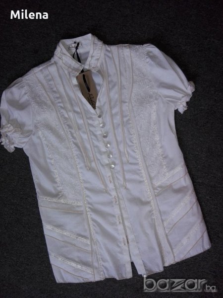 Ризата е в размери 44, 46, 48, 50 и 52. Материята е 100% памук. Моделът е подходящ и за по-едри фигури, защото материята е много еластична.На ръкава има ластик.Нова с етикет!