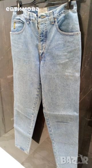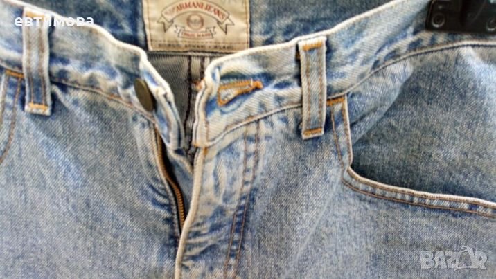 Дизайнерски оригинален Jeans ARMANI, denim. Размер 30, цвят – син светъл деним, 100% памук, мек и плътен. Размер: талия - 76 см, ханш - 100 см, от колан до чатал - 33 см, ширина крачол/бедро - 54 см, дължина от колан до подгъв/оригинал - 105 см. Оригинална дължина, не е скъсяван. Прав панталон.